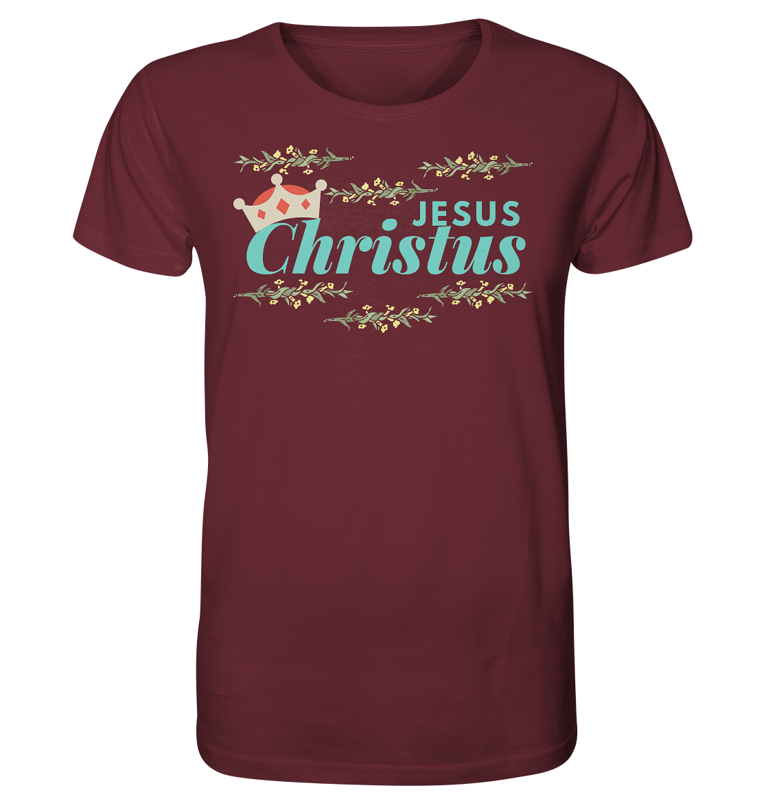 Erleben Sie die erhabene Verbindung von Glaube und Stil mit unserem exklusiven "Jesus Christus mit Krone - Organic Shirt". Der majestätische Schriftzug, gekrönt von zarten Blattmotiven und einer Krone, symbolisiert Hoffnung und Erneuerung.